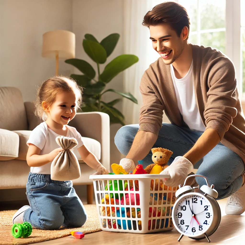 「片付けを5分間チャレンジにしよう!」と時間制限を設けることで、子どもたちは楽しく、かつ効率的に作業を進めてくれます。